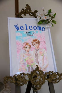 お出迎えのウエルカムボードはご友人が書いて下さったもので、桜をバックしたおふたりの