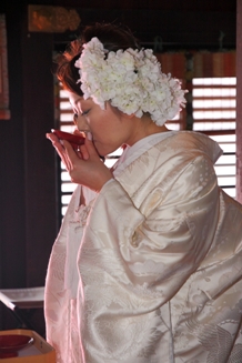 色打掛の髪飾りも、思うようなものが無く自分達で造花を用意しました。数本あったのでそれぞれをつけるのかと思っていましたが、イメージを伝えるとコームに接着して下さり1つの髪飾りを作って頂きました。本当にびっくりでした!打掛ともぴったりでしたし、おかげさまでヘアチェンジもスムーズにいきました。
