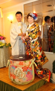 一見、お酒の樽の様ですがよいしょの掛け声でたたくと大きなクラッカーが出てきます